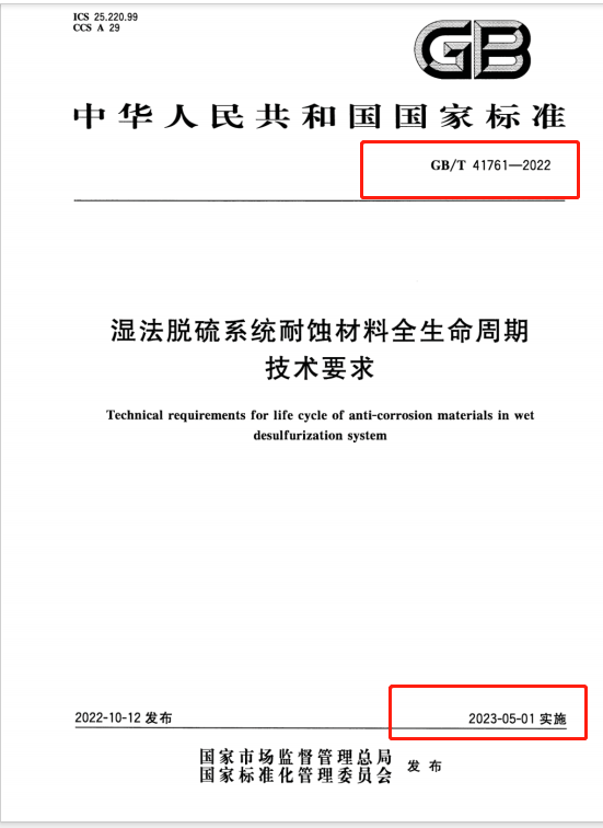 近日,安徽陶博士環(huán)保科技有限公司作為起草單位之一參與起草制定的國(guó)家標(biāo)準(zhǔn)《GB/T 41761-2022 濕法脫硫系統(tǒng)耐蝕材料全生命周期技術(shù)要求》于2023年05月01日正式施行。