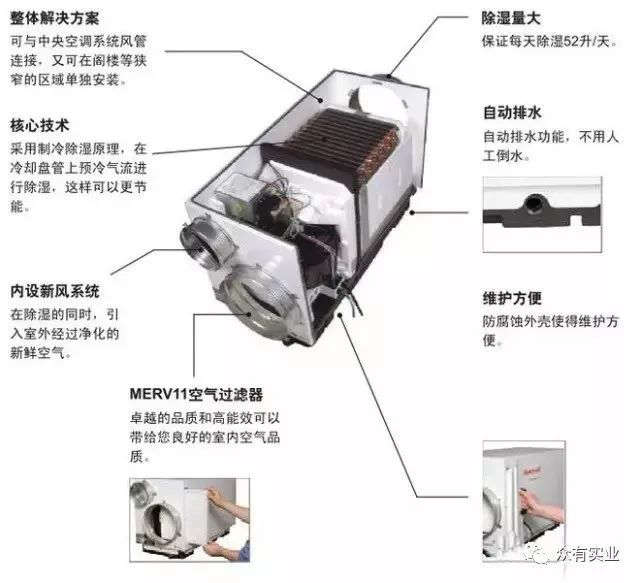 工業除濕機由壓縮機、熱交換器、風扇、盛水器、機殼及控制器組成,其工作原理是:由風扇將潮濕空氣抽入機內,通過熱交換器,此時空氣中的水份冷凝成水珠,變成干燥的空氣排出機外,如此循環使室內濕度降低。
