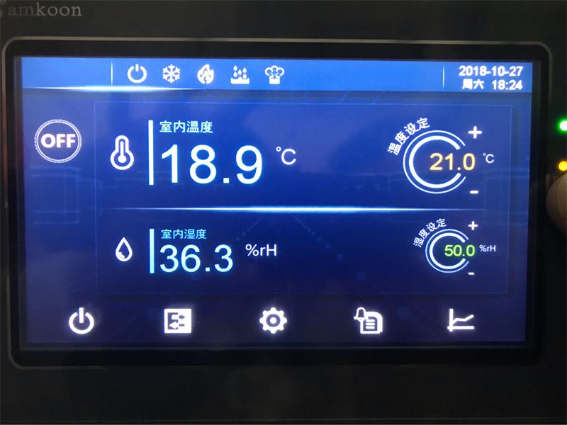 房間溫濕度傳感器分別采集房間溫,濕度實(shí)際值后,把信號(hào)送到多功能控制器RWX62.7034與設(shè)定值比較,根據(jù)計(jì)算結(jié)果,控制器輸出相應(yīng)信號(hào)自動(dòng)控制冷水電動(dòng)比例調(diào)節(jié),電加熱器,電極加濕器,來(lái)調(diào)節(jié)冷量,再熱量,蒸汽量,使房間溫、濕度達(dá)到設(shè)定范圍。當(dāng)濕度高于設(shè)定值時(shí),不管溫度是什么狀態(tài)下,這時(shí)冷水閥打開(kāi),制冷除濕;若這時(shí)溫度低于設(shè)定值時(shí),電加熱分級(jí)打開(kāi),達(dá)到恒溫恒濕的效果。控制精度:溫度為±1℃ ,濕度為±5%