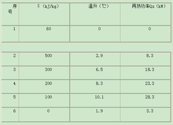 因此,從空氣處理原理可知,要確保工程內(nèi)的濕度不致過高,再熱是無法省略的,但對(duì)于余熱較小的地下工程,其再熱量是非常可觀的,表2表示熱濕比ε和再熱量之間的關(guān)系(送風(fēng)量為100kg/h,工程的相對(duì)濕度為70±5%,溫度為26℃,工程散濕量為18kg/h)。
