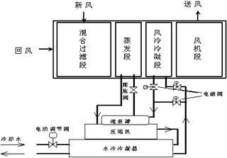 顯然,工程余熱量Q愈小,ε就愈小,要求的再熱量Qz就越大,如采用電熱,這既增加了運(yùn)行能耗,又增加了設(shè)備容量,顯然難以推廣使用。有人提出利用回風(fēng)熱回收來實(shí)現(xiàn)再熱[2]設(shè)想,即回風(fēng)和新風(fēng)混合后,不直接送至冷卻裝置進(jìn)行處理,而是先進(jìn)入一個(gè)全熱交換器與空氣冷卻裝置的出口空氣進(jìn)行(全熱)交換,一方面實(shí)現(xiàn)再熱,另一方面對(duì)進(jìn)入冷卻裝置混合空氣進(jìn)行預(yù)冷,實(shí)現(xiàn)這種設(shè)想一方面將會(huì)使裝置非常龐大,系統(tǒng)變得非常復(fù)雜,另一方面,全熱交換還會(huì)使被處理的空氣在再熱的同時(shí)被“再濕”,顯然行不通。因此,目前比較可行的方法是利用制冷系統(tǒng)的冷凝熱實(shí)現(xiàn)再熱,以替代用電及蒸汽加熱,節(jié)約大量能源。
