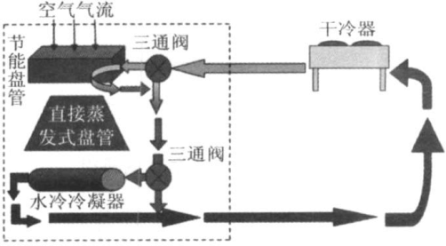 雙冷源機型可選擇冷水和壓縮機制冷系統來提供冷量。圖為雙冷源機房空調機組安裝示意圖。雙冷源機型可以利用大樓廉價的集中空調冷水 ,節約大量運行費用。而在機房空調機組充分利用集中空調系統的制冷能力的同時 ,也由于增加了集中空調系統的負荷 ,可提高其運行效率。一般集中空調只是部分時間使用 ,而機房空調機組則需全天候運轉 ,因此在集中空調冷水停供時 ,需啟動壓縮機制冷循環來提供冷量。