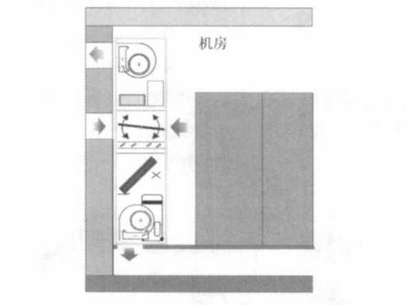 機房內部由于集中布置了大量的散熱設備 ,導致機房即使冬天也需要制冷 ,而冬季室外空氣溫度比較低,可將新風經過處理后引入室內側 ,以縮短壓縮機工作時間 ,提高機房空調運行的經濟性。圖 4 是一體式自由新風機房空調機組的安裝示意圖。圖中機房空調機組中間部位的風閥可自由擺動 ,從而可使機房空調機組在蒸氣壓縮循環制冷和室外新風制冷的不同功能間自由切換。