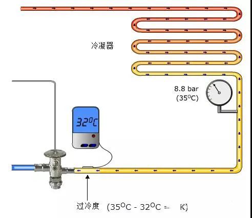 過冷度的定義:冷凝器冷凝壓力對應的飽和液體溫度和冷凝器出口液體實際溫度的差值。
